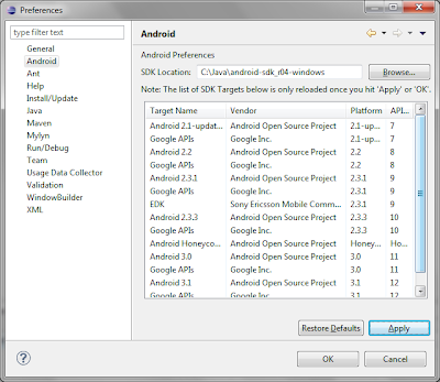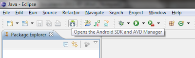 - Setelah itu akan muncul icon android seperti tampak pada gambar di bawah. Namun, sampai di sini proses untuk configurasi eclipsenya beum selesai. kita mesti menentukan dulu SDK location yang sudah kita install sebelumnya agar si eclipse ini dapat mengenalinya. caranya yaitu pilih window > preference yang akan terlihat seperti gambar berikut :